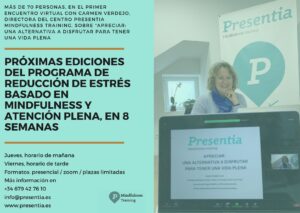Participa en las próximas ediciones de nuestro programa de 8 semanas de «Reducción de estrés basado en la atención plena o mindfulness». En horario de mañana (jueves) o tarde (viernes), presencial (con plazas limitadas y conforme a las recomendaciones sanitarias vigentes, en nuestro Centro Presentia Mindfulness Training en Granada) o virtualmente, vía Zoom.